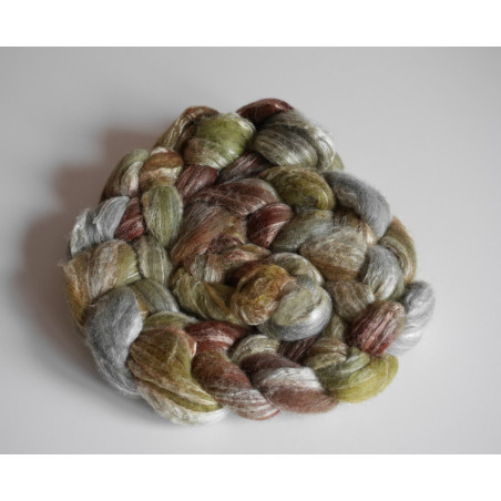 Voici 100 g de fibres à filer (ou feutrer) teintes à la main selon l'humeur du moment. Très douces et faciles à étirer, elles s'adaptent à tous les styles de filage (même dentelle).