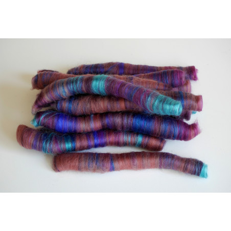 Une douzaine de rolags à filer en laine mérinos très douce, soie, Nylon et angelina (fibres synthétiques brillantes) pour mieux scintiller ! Idéaux pour le filage "long draw" permettant d'obtenir un fil gonflant et moelleux (woolen), ils s'adaptent à tous les styles de filage (même dentelle).